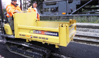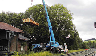 Der Bahnhof von Günzach im Landkreis Ostallgäu liegt an der Bayrischen Allgäubahn. Hier wurde der Mittelbahnsteig neu asphaltiert und ein Streifen an der Bahnsteigkante gefräst. Da der Bahnsteig inmitten des Gleisbettes zwischen zwei Gleisen verläuft und so für schwere Arbeitsmaschinen nicht zugänglich war, wurden die benötigten Geräte per Autokran auf den Bahnsteig gehoben.